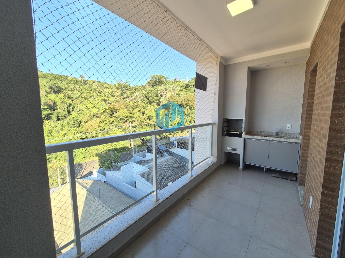 Apartamento com móveis planejados, ar condicionado na sala e varanda com churrasqueira.